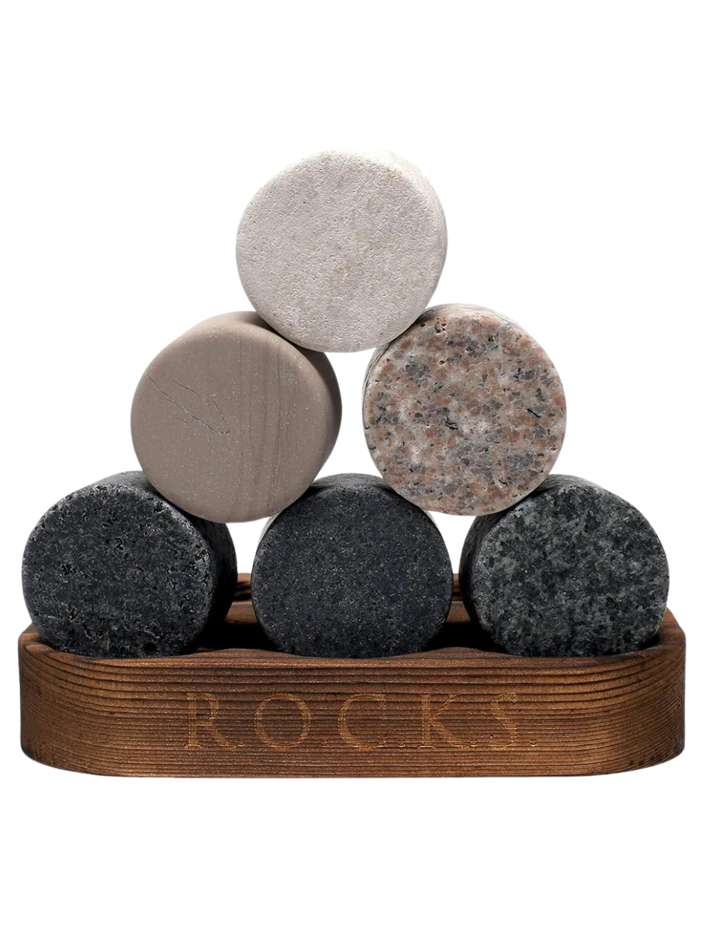 Each R.O.C.K.S. gift set includes one premium crystal whiskey glass with diamond-cut pattern, six natural granite stones in varied colors, a hand-crafted wooden display tray, and elegant gift packaging.